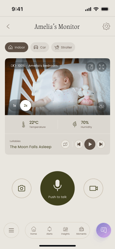 The only monitor designed to go wherever baby goes — from nursery to car to stroller. One device that works with your baby's schedule, not against it.